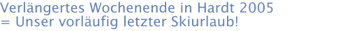 Obwohl wir eigentlich aus Zeitgründen keinen Winterurlaub mehr machen wollten, spricht ja nichts gegen ein Wochenende im Schnee! Da war der 6. Januar (Feiertag in BaWü) ein geeignetes Datum, um 4 Tage Wintersport zu planen. Dies gestaltete sich schwierig, da die meisten Vermieter lieber Gäste für eine Woche nehmen! Nicht aber die Wirtin vom Zweckerhof in Hardt im Zillertal. Hier waren wir schon einige male im Ferienhaus von Jens' Firma, dem Haus Resi! Bei ihr haben wir ein ganzes Stockwerk für uns buchen können: 3 Schlafzimmer, Wohn- und Eßküche sowie ein Bad!
