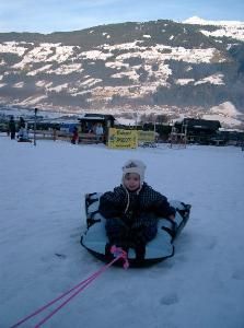 Nachmittags gehen sie zum Bobfahren nach Fügen! Mit dem aufblasbaren Bob macht das sehr viel Spass! Vor allem wenn man seinem "Zugpferd" sagen kann wo's langgeht! Da vergeht die Zeit wie im Flug und es ist auch gar nicht kalt. Dafür sorgt natürlich auch der schöne, warme Schneeanzug.